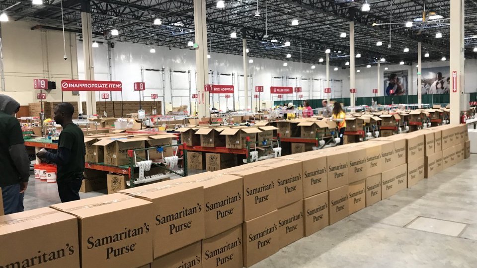 At the processing center volunteers open each of the shoeboxes and verify the contents