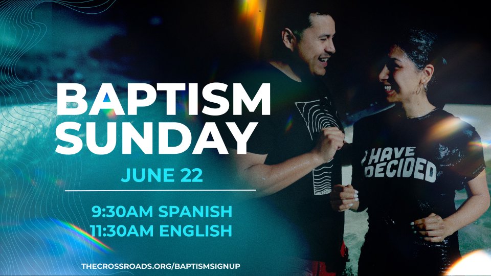Join us for Water Baptisms at Church of the Crossroads on June 22 in both services. Sign up on www.thecrossroads.org/baptismsignup . Please note that attendance at the mandatory class prior to Baptisms.