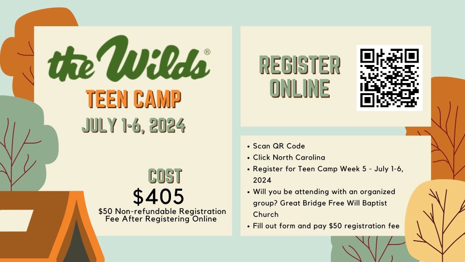 Our Teens will be going to the Wilds Camp in Brevard, NC. Campers must be at least 12 years old by September 1, 2024, and going into Grades 7-12 or just completed Grade 12. The date for the camp is July 1-6, 2024. The cost is $405 which includes $30 "Bonus Bucks" to spend at camp for snacks, merch, books, and anything else the Wilds has to offer.
