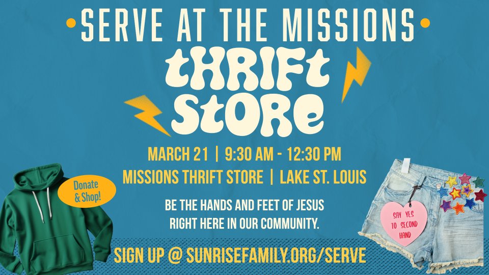 Looking for a simple way to serve close to home? Join us Saturday, March 21, from 9:30 am to 12:30 pm at the Missions Thrift Store in Lake St. Louis. Help make a difference, donate, shop, and be the hands and feet of Jesus right here in our community. Sign up below!