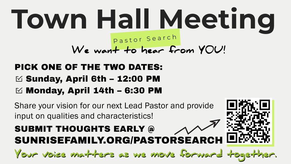 Join us for one of our upcoming Town Hall Meetings as we seek your input on the qualities and characteristics of our next Lead Pastor. This is your opportunity to share your hopes and vision for the future of SunRise Church.