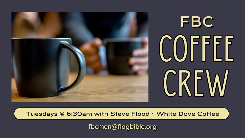 Come hang out with other men Tuesday mornings at White Dove. Bring your Bible for fellowship, prayer, and devotion.