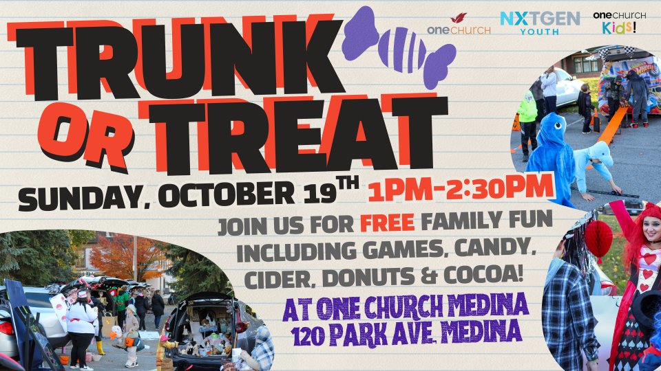 Join us on Sunday, October 19th from 1:00–2:30 PM at One Church Medina (120 Park Ave, Medina) for a fun-filled afternoon the whole family will love!