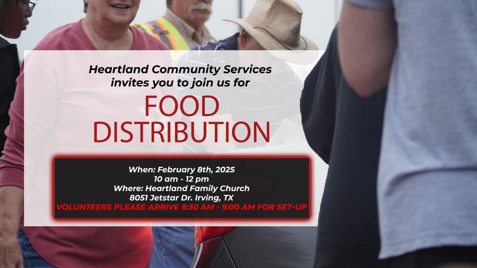 The food distribution will take place February 8TH from 10AM to 12PM at Heartland Family Church in Irving!