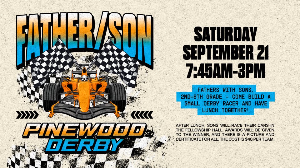 Fathers with sons in 2nd-6th grade, come build a small derby racer and have lunch together! After lunch, sons will race their cars in the Fellowship Hall. Awards will be given to the winner, and there is a picture and certificate for all. The cost is $40 per team. Sign up in the Children’s Ministry Office after services.