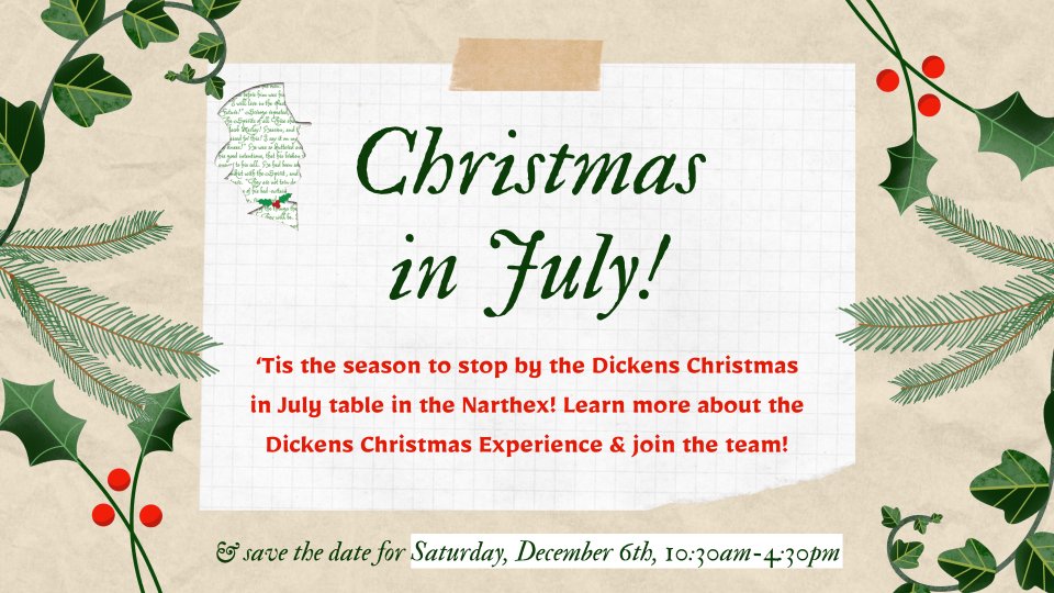 The Dickens Christmas in July table will be open in the Narthex every Sunday in July after both worship services. Come say hi!