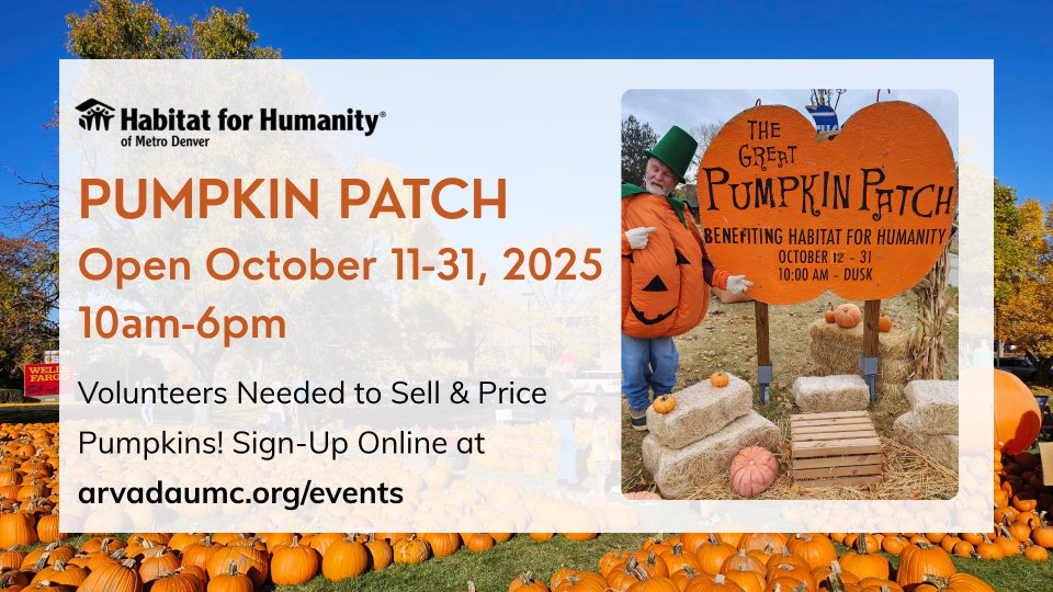 Help turn pumpkins into homes by visiting the Arvada Habitat for Humanity Pumpkin Patch. Located at Community of Grace: A Presbyterian Church, the patch will be open from 10am-6pm everyday from October 11th-Halloween.