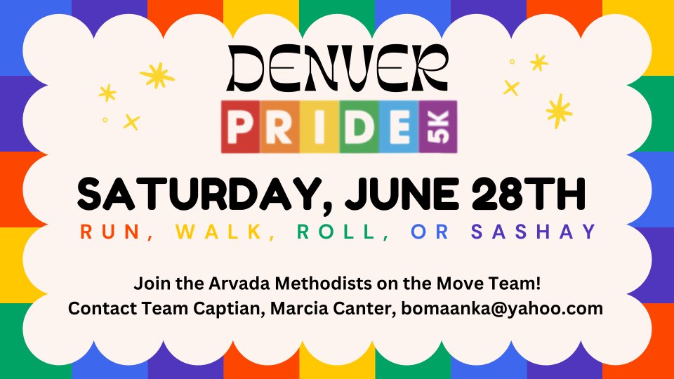Run, Walk, Roll, or Sashay! Join the Arvada Methodists on the Move team at the Denver Pride 5K! Click the button below to sign up. For more information about meeting up with the team, contact Marcia Canter bomaanka@yahoo.com