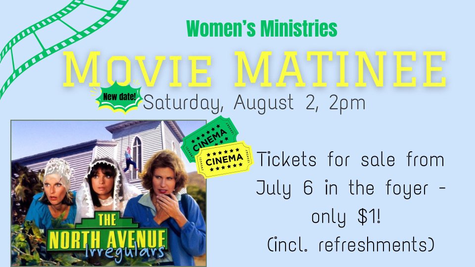All women are invited to a fun afternoon at a Movie Matinee on July 26th at 2pm. The featured movie is The North Avenue Irregulars....."A new preacher in town joins forces with an unlikely group of crimefighters: six dedicated church ladies who are ready, but not necessarily equipped, to help."