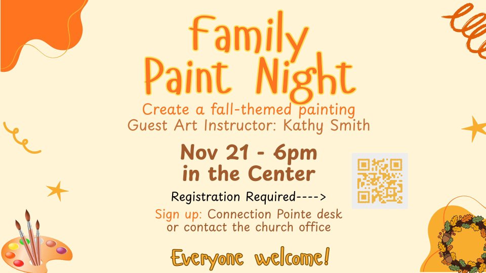 Join us for a cozy evening of creativity and fun on Thursday, November 21st from 6–8 PM in The Center at church! Bring the whole family and enjoy painting a beautiful fall-themed canvas with step-by-step guidance from instructor Kathy Smith. No experience needed — just come ready to relax, laugh, and make some autumn memories together! 🍂