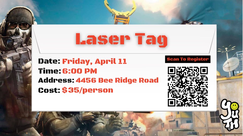 Friday, April 11 we will be transforming the church into a Laser Tag Battlefield! You ABSOLUTELY want to invite your friends to this! It's going to be EPIC!