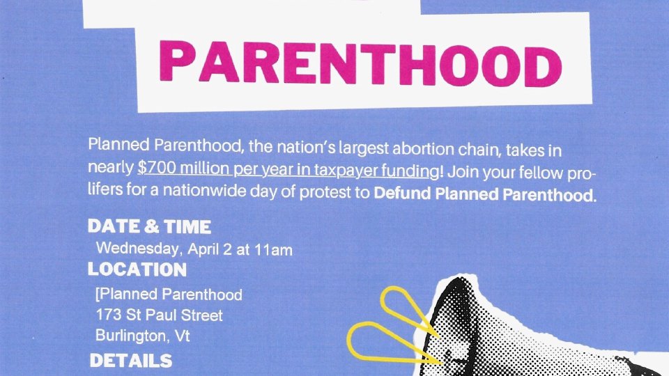 Join 40 Days for life and "Pro-life Action leagues Nationwide Protest" for the defunding of Planned Parenthood. At 11:00 a.m. April 2nd at the Planned Parenthood office on 173 St Paul Street Burlington. For more details see John Averill after service in the Lobby.