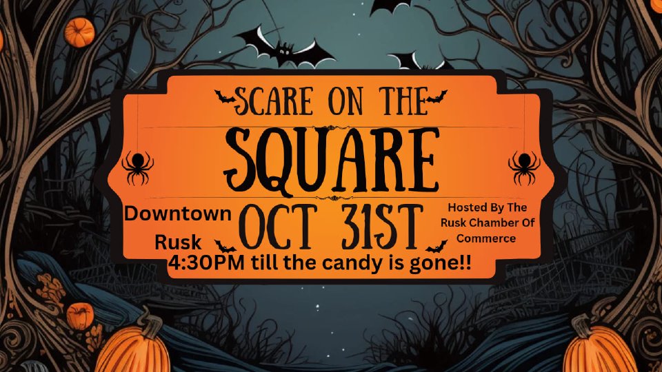 Be there or be square! Rusk Chamber of Commerce's annual Scare On The Square! Join The Chamber & several community businesses for massive trick or treating absolutely free!
