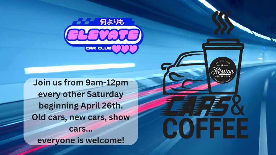 Mission Coffee & Tea has partnered with Elevate Car Club, a local group of car enthusiasts, to host their car cruises every other Saturday morning in the Kittanning campus parking lot (Mission Coffee entrance). All are welcome to bring a car to show, or just stop in and check it out!