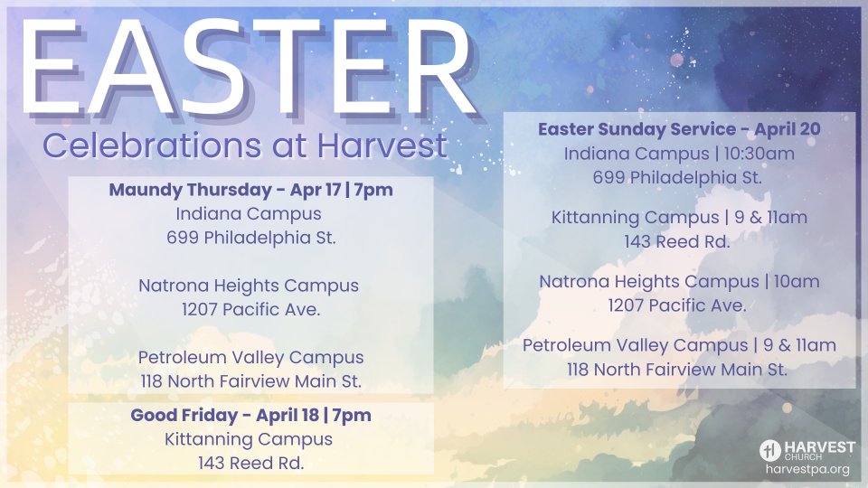 If you already attend a Harvest Campus, we encourage you to use this opportunity to visit a different campus for the Maundy Thursday or Good Friday Service!