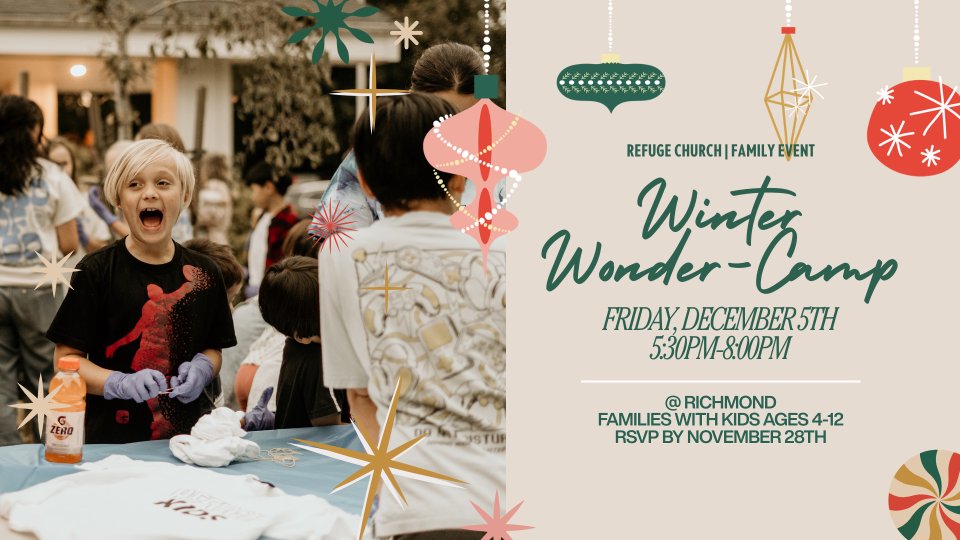 Join us for our Christmas family event! We will be enjoying dinner together and doing fun Christmas-themed activities. This event is for families with kids from ages 4-12 and will be taking place at our Richmond location.