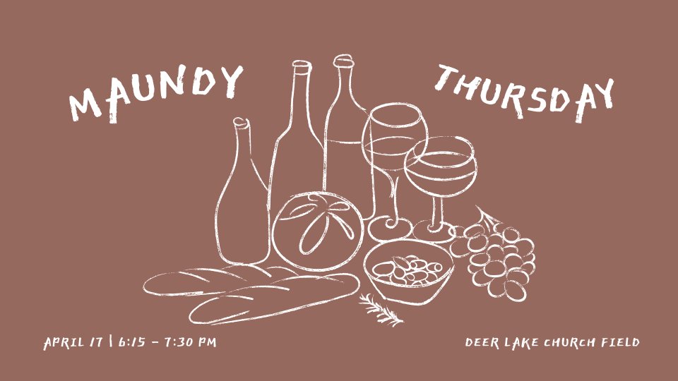 Join us on Thursday, April 17th at 6:15 pm on the Deer Lake Church field (weather-permitting) for a potluck dinner and Passover experience. We'll eat together, hear from "the 12 disciples," sing a hymn, and celebrate communion together. All ages are welcome to join!