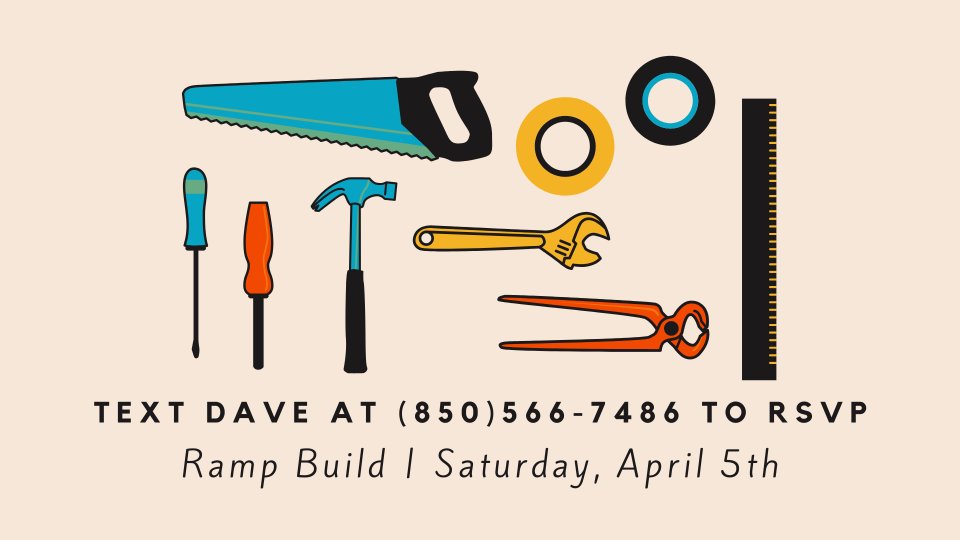 Our next life-changing ramp project takes place Saturday, April 5th. Please be at the church that morning to carpool or plan to meet us on site. Time TBD. Missions will be providing lunch, snacks, water, Gatorade, and soft drinks. Text or call Dave Hodges at (850) 566-7486 for the address/more details or to let us know you’re coming.