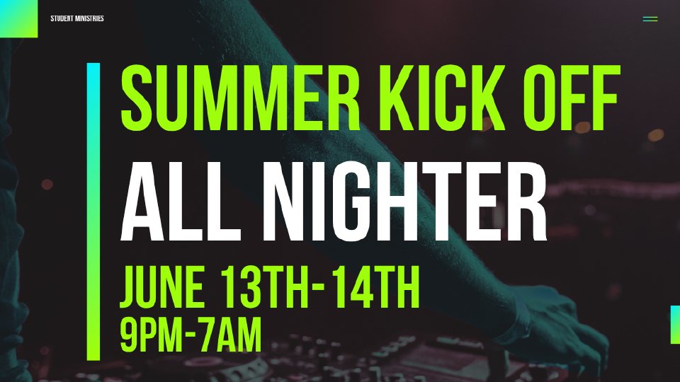 Student Ministries will be kicking off the Summer with an all-nighter event! This event will be $25 and will run from 9 pm on June 13th to 7 am on June 14th. It's going to be a wild night with great food and games! Registration and a completed medical release are required to attend this event!