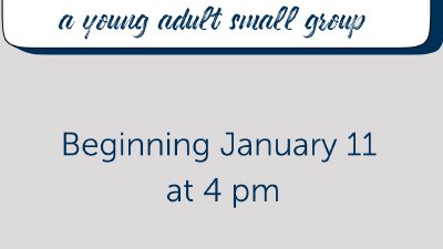 Sundays at 4pm come gather with other young adults for a time of fellowship and Bible study.