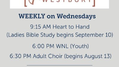 Midweek offers a ladies Bible study, Heart to Hand, Wednesday Night Live (WNL) for youth in MS and HS, and Adult Choir rehearsal. 6:00 pm WNL (Youth) is ongoing 6:30 pm Adult Choir begins August 13 9:15 am Heart to Hand fall session begins September 10 - November 19