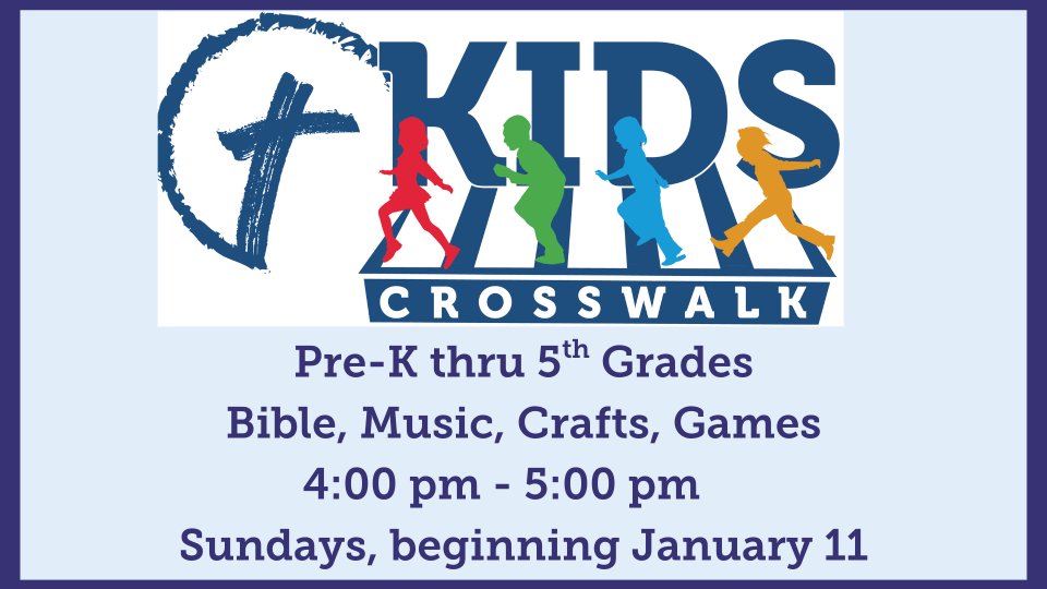 Sundays at 4:00 pm - 5:00 pm children age 4 years old by Sept. 1 through 5th grade will learn to walk with Christ as they participate in fun Bible study games, crafts and activities. This fall children’s choir will be returning as Children’s Worship Arts and is a part of Kids Crosswalk.