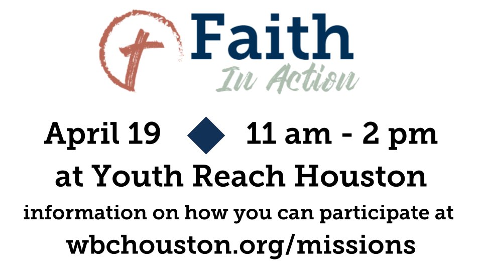 Faith in Action Day is April 19 at Youth Reach Houston from 11 am - 2pm. We will grill lunch for the boys and get a chance to meet them and fellowship. Another way you can help is to make a casserole to donate to Youth Reach. These meals will be used for feeding the boys and/or staff families. For more information, contact Joan Ross at joanross@wbchouston.org.
