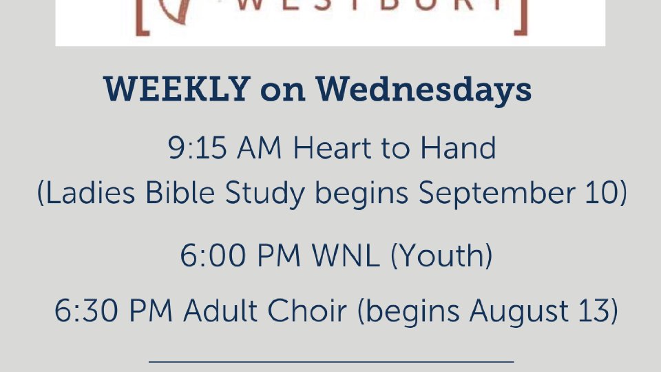 Midweek offers a ladies Bible study, Heart to Hand, Wednesday Night Live (WNL) for youth in MS and HS, and Adult Choir rehearsal.