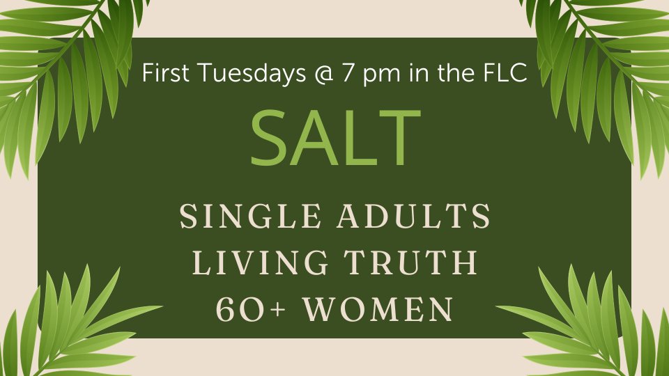 Single women age 60+ meet on the first and third Tuesday of each month. The first Tuesday is for a book study and prayer and they have dinner at Cafe Express on the third Tuesday at 6:30 PM.