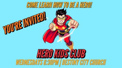 Bring your kids for an exciting new adventure where they’ll learn what it means to be a H.E.R.O.: 🛡 Honor 💬 Encourage 📈 Rise 🙌 Obey We’ll have praise & worship, games, fun Bible lessons, and tons of surprises along the way. 🎉 👗 Kids are welcome to come dressed as their favorite superhero—cape or no cape, they’re going to have a blast while learning to be a hero in Christ! 📍 Destiny City Church 🗓 Every Wednesday starting next week ⏰ 6:30 PM