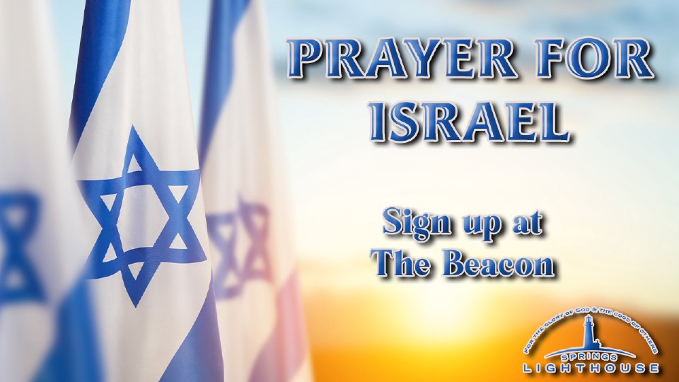 Join us at Springs Lighthouse for a prayer meeting for Israel. In light of the ongoing turmoil in the region, we will come together to pray for the people of Israel and for peace. Please join us as we lift them up in prayer. We meet every Tuesday night at 6:30 PM at Springs Lighthouse.