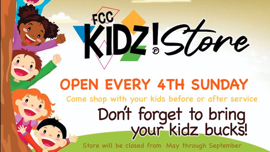 Parents - it's time for the FCC Kidz! Held every fourth Sunday of the month—the FCC Kidz store is a fun-filled shopping adventure designed just for kids! Make sure to remind your little ones to bring their Kidz Bucks so they can enjoy all the exciting surprises and special deals waiting for them.