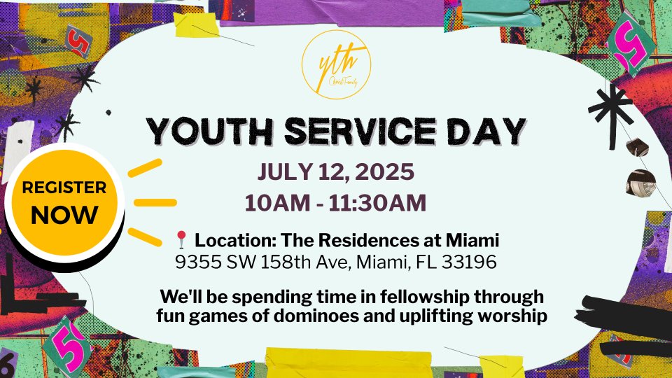 We're inviting all youth to join us for a special service event at The Residences at Miami. We’ll spend the morning playing dominoes, sharing laughter, and lifting up the name of Jesus through worship with the senior residents. It’s a great way to give back, build friendships, and reflect God’s love in action.
