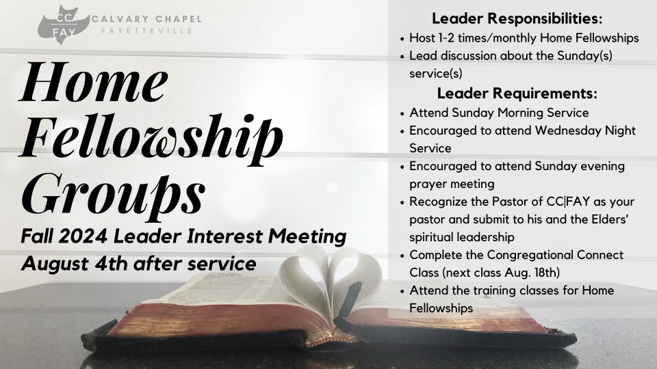 Fall is right around the corner, and we are looking for Home Fellowship Leaders for this next season. Home Fellowship groups are a wonderful way to get connected and to deepen your walk with the Lord here at CC|FAY. We would love to open more homes this fall! If you are interested in learning more about being a Home Fellowship Leader, please discuss and pray about it with your spouse and join us for an Interest Meeting on Sunday, August 4th after service, in the sanctuary. If you have any questions before then, you may ask a previous Home Fellowship Leader and/or Pastor Rick.