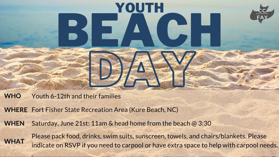Youth! This one's for you and your families! 6th - 12th graders your leaders have organized a time to get together and hang out at the beach! Please mark your calendars for Saturday, June 21st and start talking to your friends about joining in on our beach trip to Fort Fisher State Park! Youth (& families), please bring your own food, drinks, swimsuits, sunscreen, towels, and chairs/blankets. Please RSVP right here and let us know if you need to carpool or if you have any extra seats for those who may need a ride.