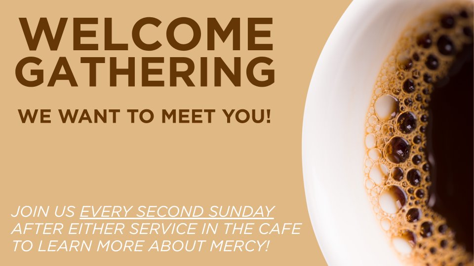 Every month on the second Sunday of the month, Mercy invites visitors and new attendees to come to the Welcome Gathering in the Cafe after either the 9:00 AM or 10:30 AM service. Come meet one of our pastors, ask questions, enjoy some snacks, and get to know some new people!