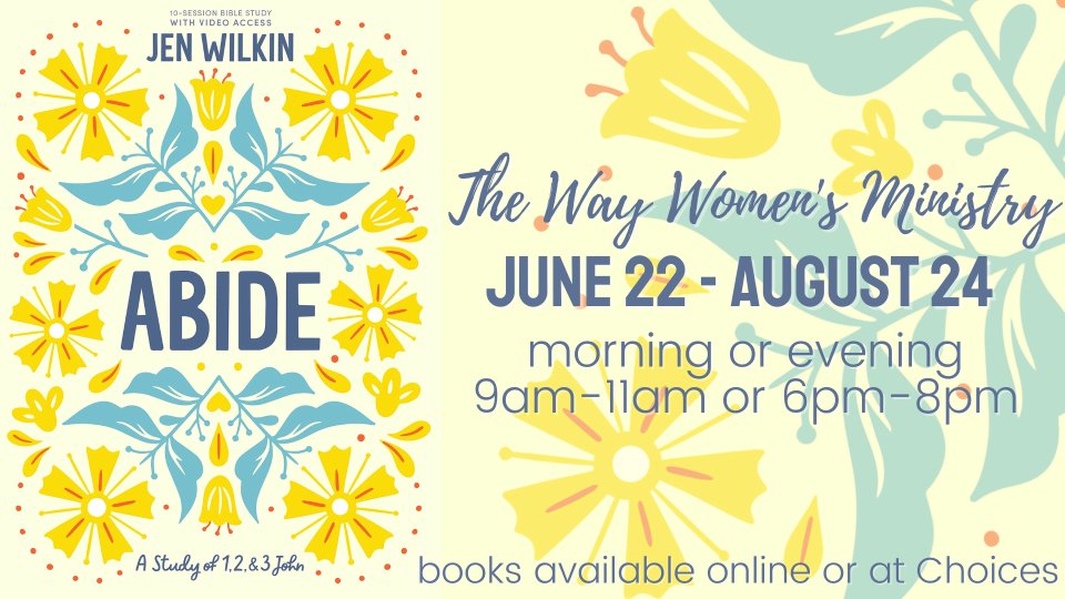 Join us as we dive into 1, 2 and 3rd John through Jen Wilkin's new study, Abide! We will start June 22 and end August 24. All ladies are welcome! We have a morning class, 9am to 11am and an evening class 6pm to 8pm. Books are available online or at Choices.