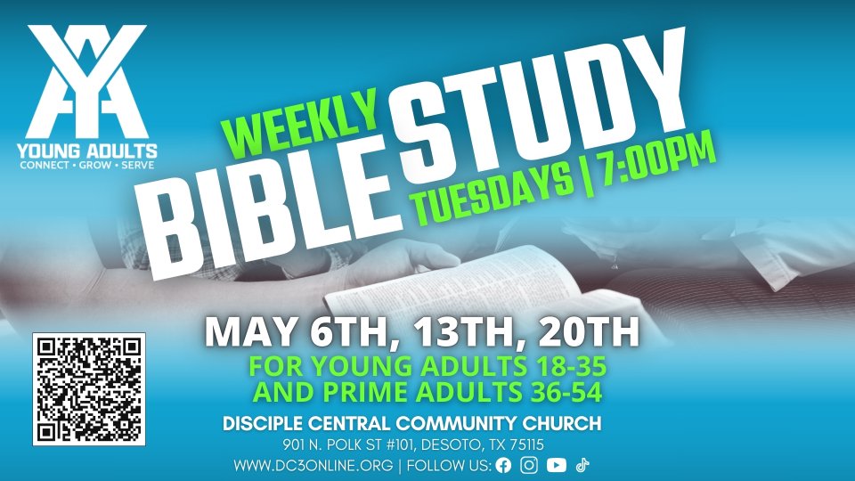 Come study the Word of God together in fellowship with the Young Adults of DC3! First 3 Tuesdays of May at 7:00 PM.