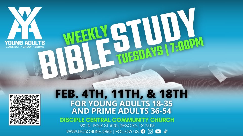 Come study the Word of God together in fellowship with the Young Adults of DC3! First 3 Tuesdays of February at 7:00 PM (02/04, 02/11, and 02/18).