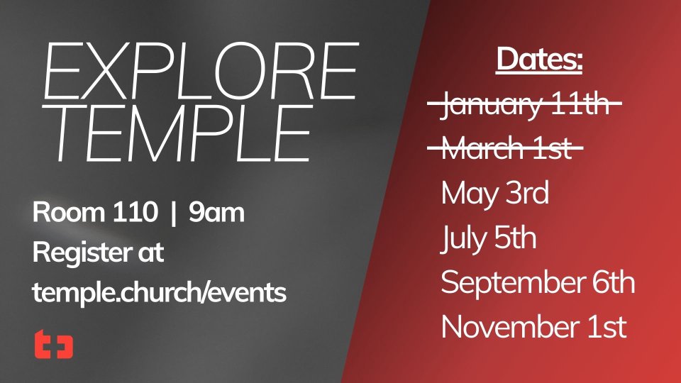 Join us May 3rd in the Green Room (In room 110) at 9am to connect with Temple's core leaders and pastors. We provide an opportunity to discuss who Temple is, the value of membership, and answer any questions. Childcare is provided.