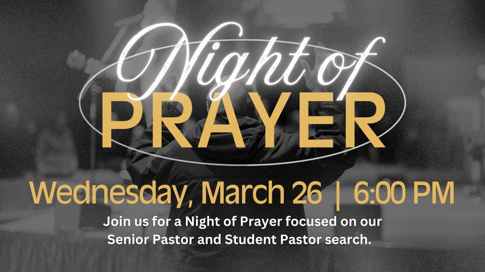 Join us for a Night of Prayer as we gather together with our church family to pray for our Senior Pastor and Student Pastor search. 6:00 PM in the Worship Center.