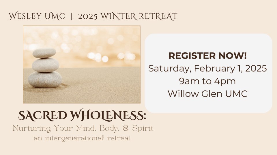 All are invited to participate in Wesley UMC’s 2025 Winter Retreat, Sacred Wholeness: Nurturing Your Mind, Body, & Spirit on Saturday, February 1, 2025 at Willow Glen UMC.