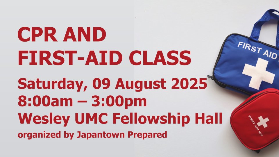 Register by contacting (jeffrey.oldham@gmail.com). This course is organized by Japantown Prepared!, which helps Japantown prepare for and respond to disasters.