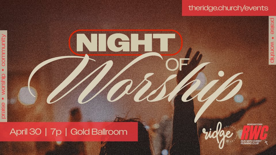 Ridge College invites you to a powerful Night of Worship in partnership with Morgantown Run With Christ on April 30 at 7p in the Gold Ballroom at the WVU Mountainlair! Come as you are and join us for an evening centered on worship, community, and connection. Whether you're a student or a young adult in the area, this is a space to gather, enjoy great food, and reset our hearts and minds on Jesus through praise!
