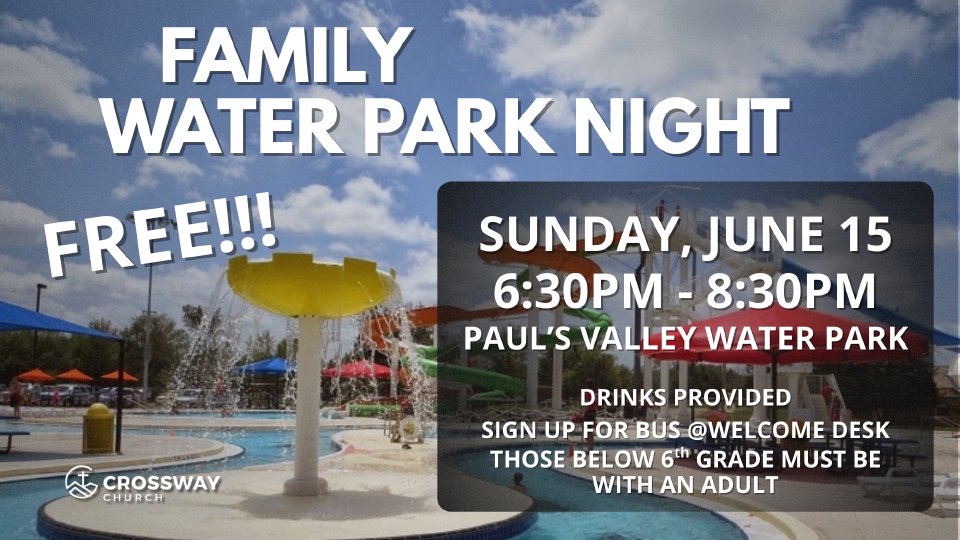 Each year on Father's Day Sunday evening at Crossway we take a trip over to the Pauls Valley water park for a night of free family fun in the sun! Come join us this year. Drinks will be provided for those in attendance and there will be a sign up for the bus if you need a ride in the welcome desk. 6th graders and below must be with an adult.