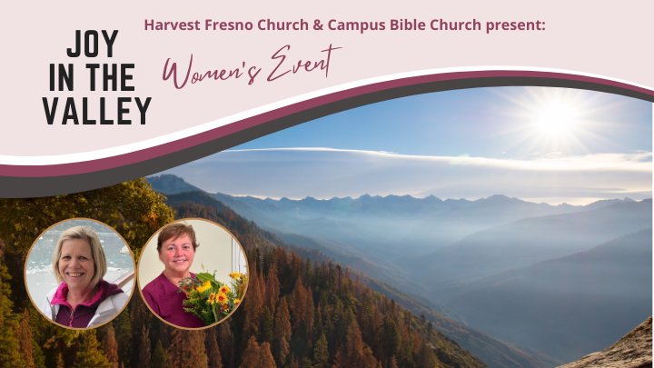 Joy in the Valley: A half-day women's event, co-hosted by Harvest Fresno Church and Campus Bible Church, featuring Laura Hopper and Margaret Nenadov, who will share how God equips us to endure trials and even find joy in the valley. There will be a Continental breakfast, two speaking sessions, worship, and a breakout session during lunch.