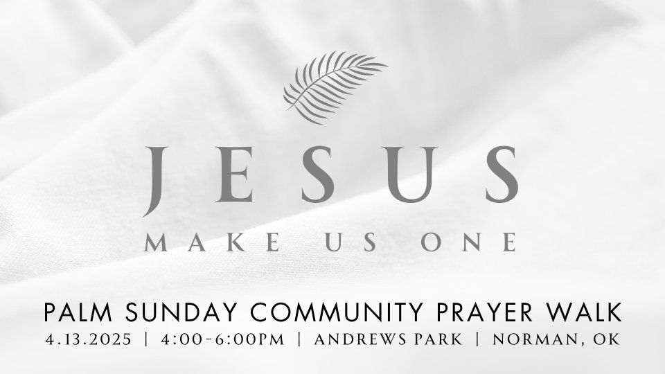 We invite the body of Christ to gather for a Palm Sunday Community Prayer Walk at Andrews Park in Norman, OK on April 13, 2025 from 4:00-6:00pm to walk, pray, and worship around the Lord’s Prayer that we read in Matthew 6:9-13 and the prayer of Jesus that we read in John 17:21. This is a time for the body of Christ to gather together for a public display of unity in our community. Stay connected and learn more by visiting: