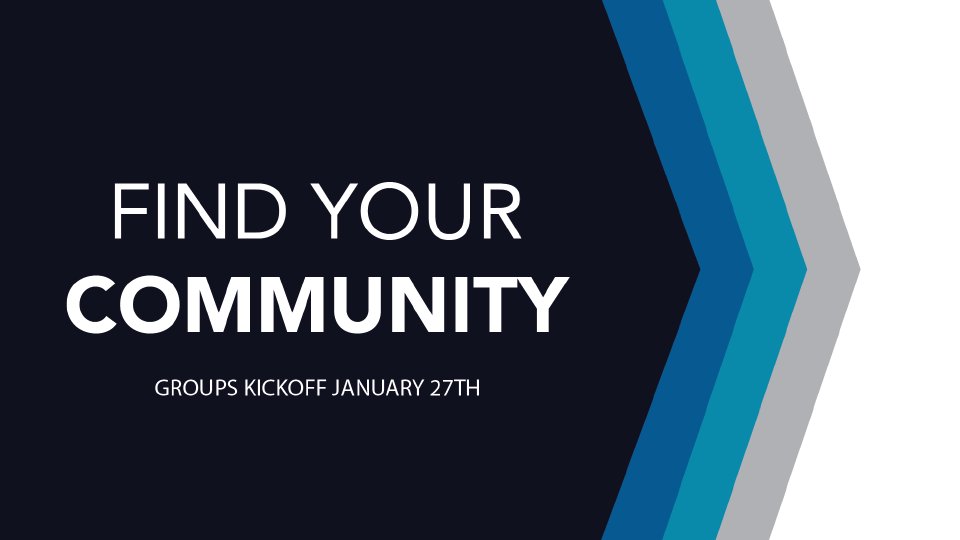 Groups will kickoff on January 27th! We believe that people grow the most in their relationship with Jesus when they experience His love through groups. Keep an eye out for our group's table in the lobby this Sunday to learn more, or click the link below to sign up.