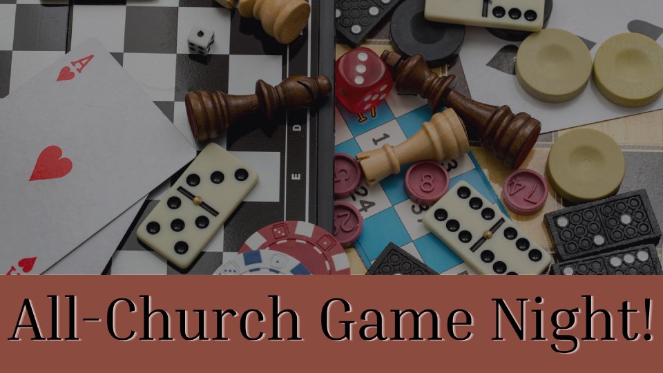 Game night for the ENTIRE church! Bring your favorite game and gather together in the Worship Center for a fun evening! 6:30-8:30pm. Popcorn & cookies provided for all!