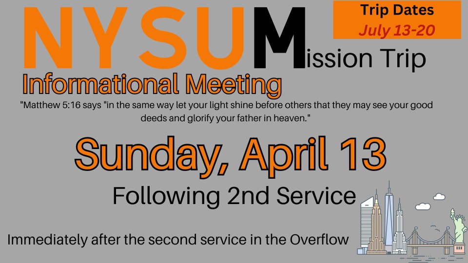 There will be an informational meeting for the summer mission trip to NYSUM. (New York School of Urban Ministry) The actual trip will take place JULY 13 -20.